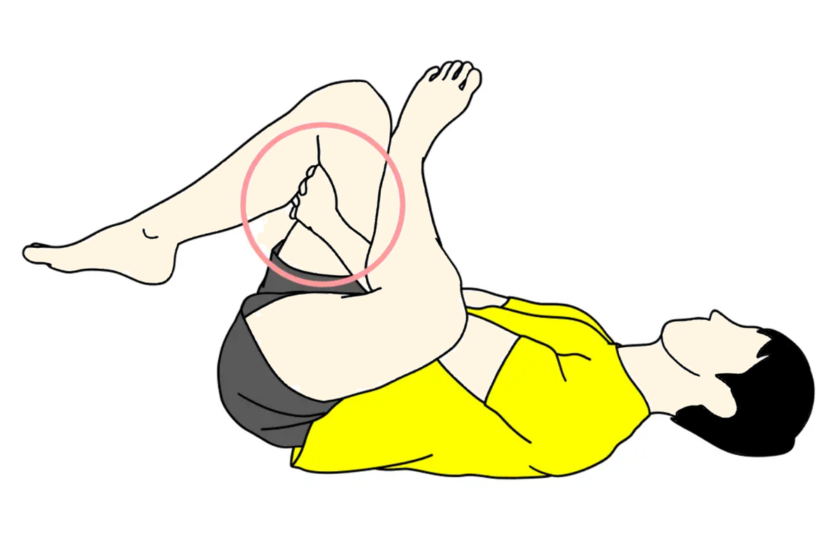 仰向けの状態から片膝を立て、その膝の上にもう片方の足のくるぶしを乗せる。